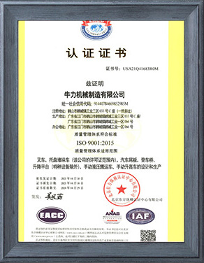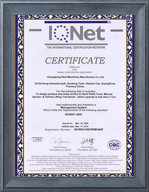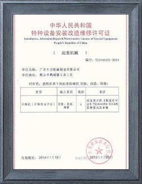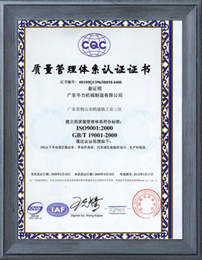 公司先后獲得了ISO9001質量管理體系認證,歐洲CE/GS認證,SGS國際認證服務公司認證審核,國家質監總局頒發的特種設備制造許可證,廣東省高新技術企業認證,廣東省工程技術研究中心等。